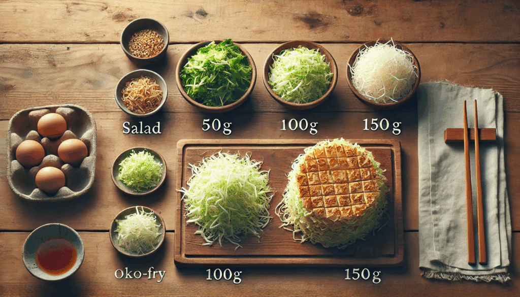 加熱するとカサが減るため、多めに入れても良いです。 - お好み焼き → 1枚につき 約150g。
