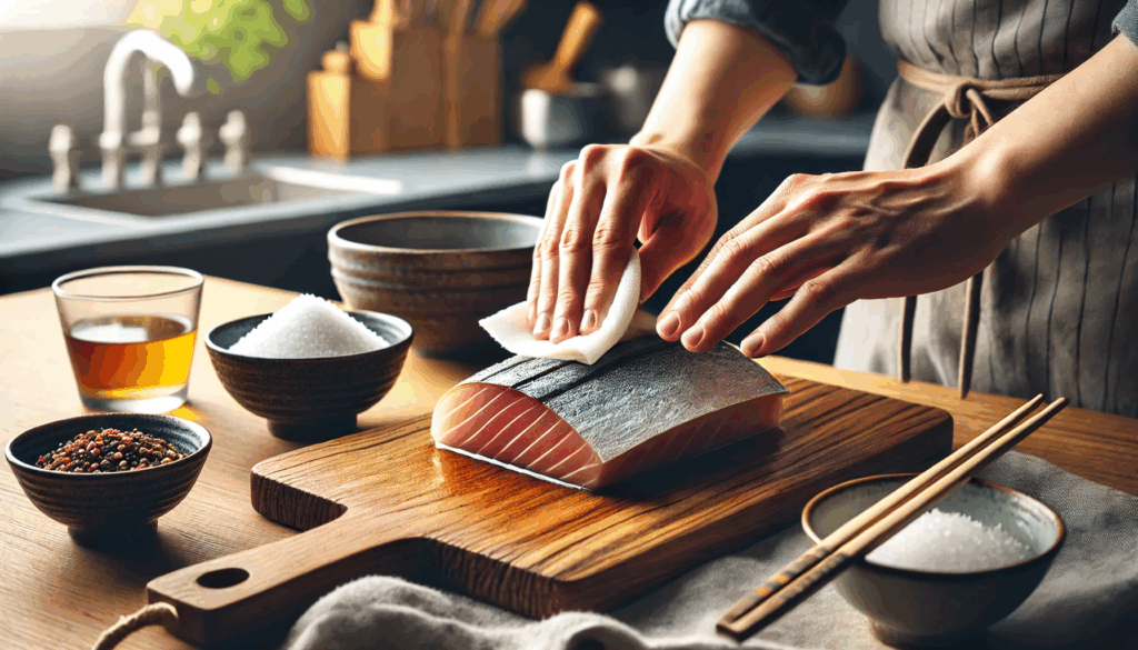 1. 塩と酒で臭みを抜く: 軽く塩をふって5分おき、表面の余分な水分を拭き取ります。