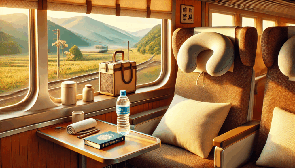 クッション、飲み物、軽食、イヤホン、モバイルバッテリー、首枕、アイマスク、保湿ティッシュ、ウェットシート、薄手の羽織、軽食、ゴミ袋など。冷房対策と衛生グッズがあると安心です。