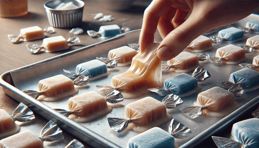 溶けた飴が包み紙にくっついてしまったときは、冷凍庫に入れるのが一番のコツです。30分ほど冷やすと飴がしっかり固まり、包み紙との接着部分がはがれやすくなります。特にキャラメルやフルーツキャンディなど、砂糖の濃度が高い飴はこの方法が効果的です。冷凍庫から取り出したら、包み紙を端からゆっくり引っ張ると、スッときれいに剥がせますよ。