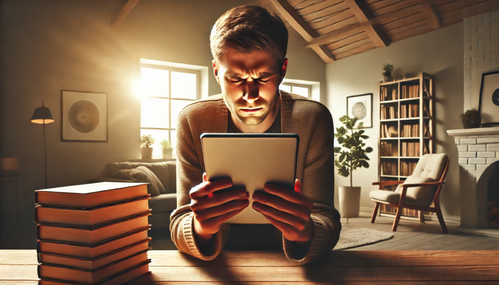 スマホやタブレットは便利ですが、画面の光を長時間浴び続けるとどうしても目に負担がかかります。「少し読んだだけで疲れる」「寝る前の読書がつらい」など、目の疲労を感じる方も多く、ブルーライトの影響を気にする方にとっては大きなデメリットです。特に夜のリラックスタイムに読書をしたい方にとっては、眠りにくくなるという声もあります。