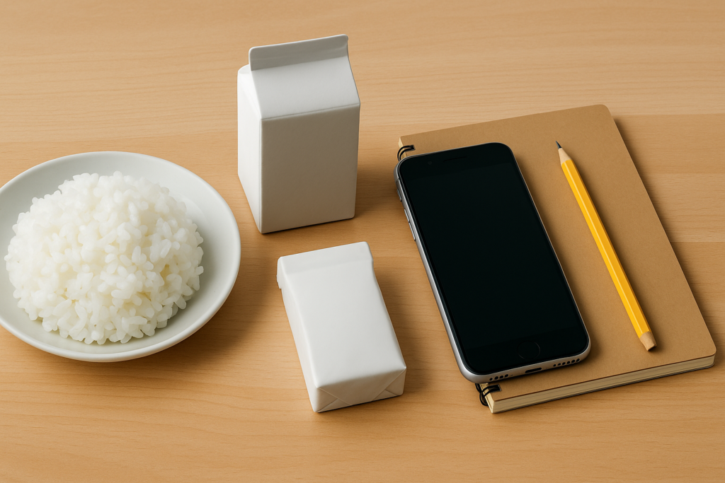 ご飯や肉、牛乳からノートやスマホまで、さまざまなモノと結びつけて考えることで、その重さの感覚はぐっと身近になります。