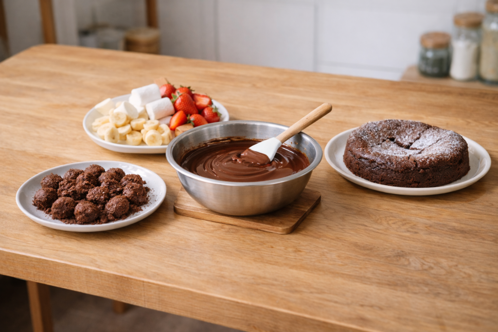 チョコフォンデュは、多少なめらかさにムラがあっても楽しみやすいアレンジです。
