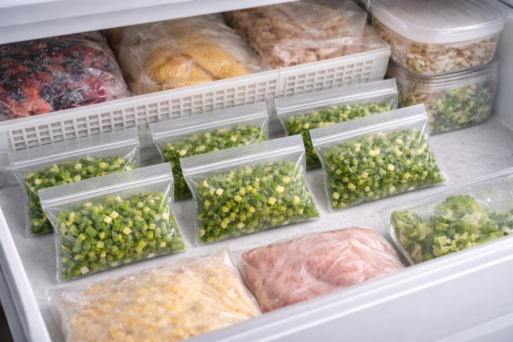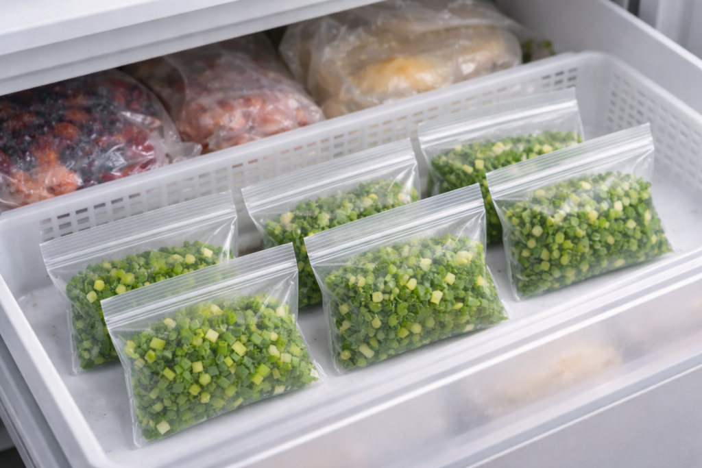 万能ねぎは、少量ずつ冷凍しておくととても便利です。使う分だけ取り出せるため、解凍と再冷凍を繰り返す必要がなく、品質の低下を防ぎやすくなります。