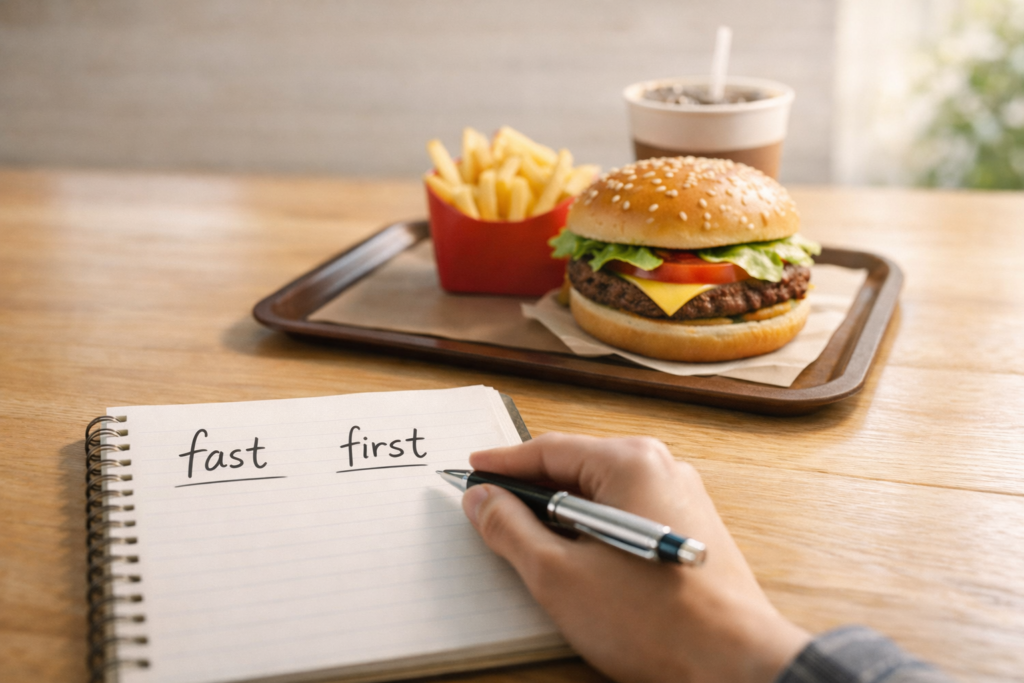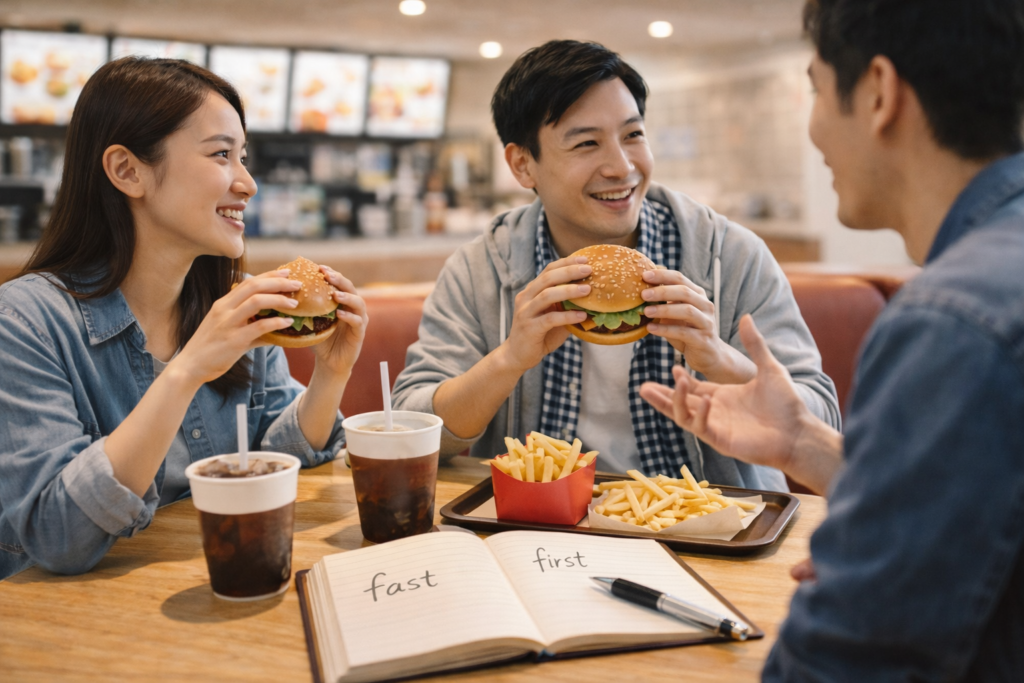 一方で「ファーストフード」は英語の first food に近い表現になり、本来の意味とは少し違ってしまいます。