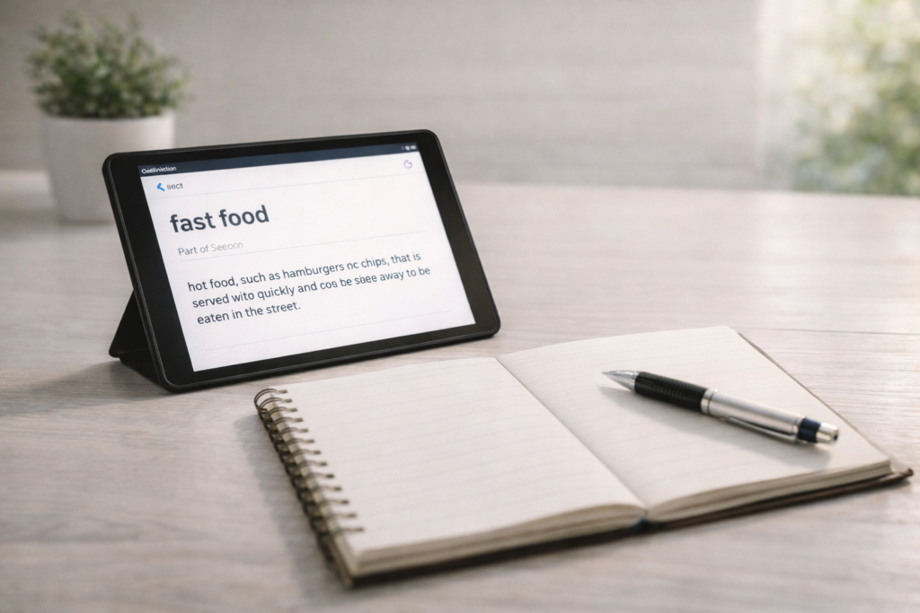 英語辞書では fast food は「短時間で調理され、すぐに提供される食事」や「手早く食べられる外食の一種」といった意味で説明されています。