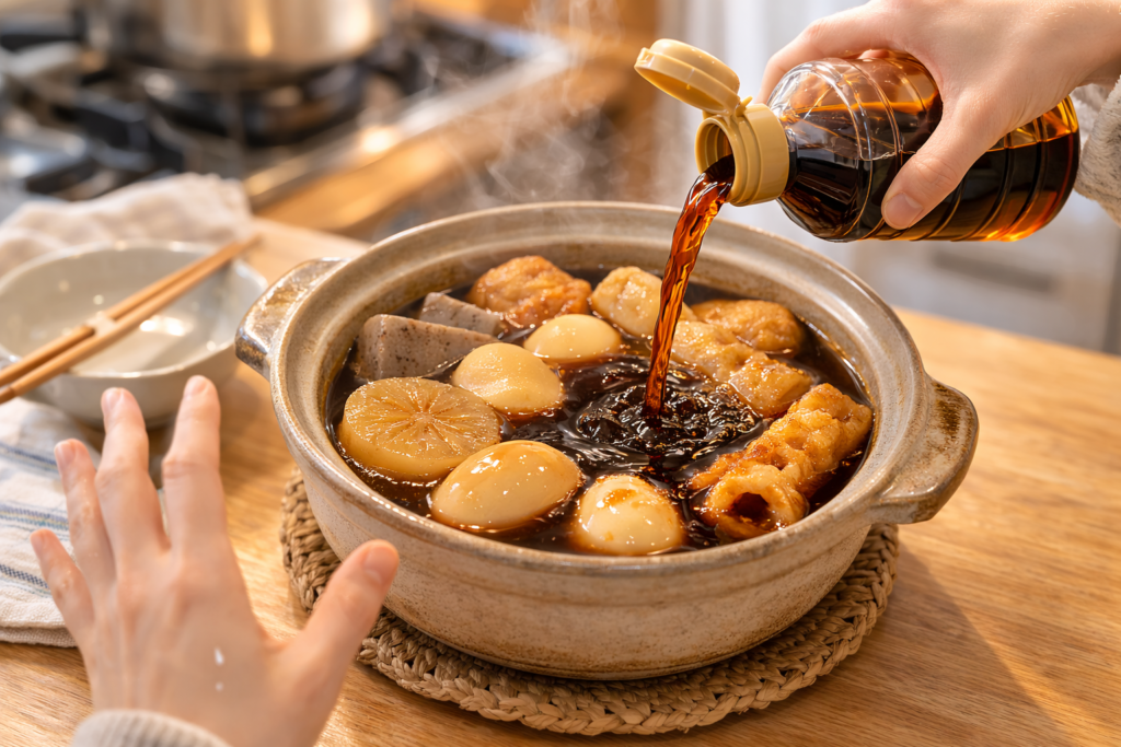 おでんの味を整えるときは、調味料の使い方が大切です。