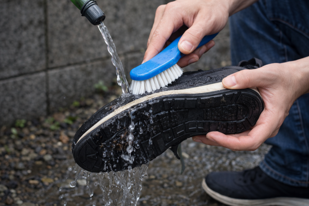 特に靴底の溝は汚れが残りやすいため、丁寧にこするのがポイントです。