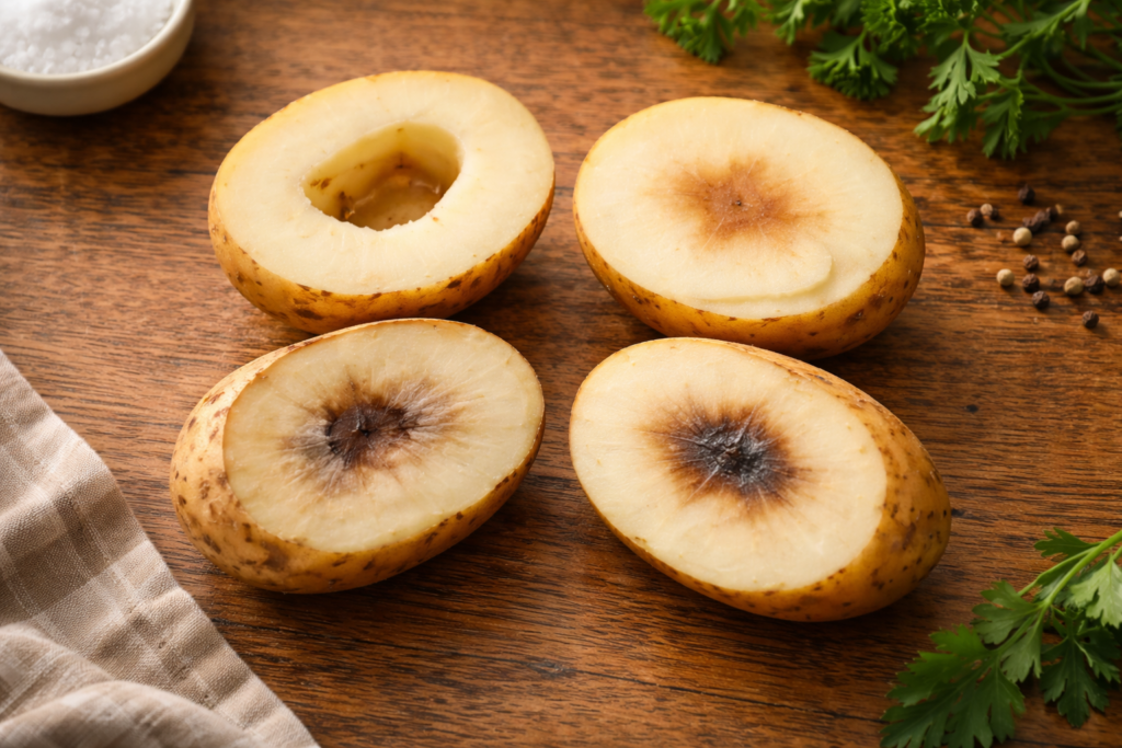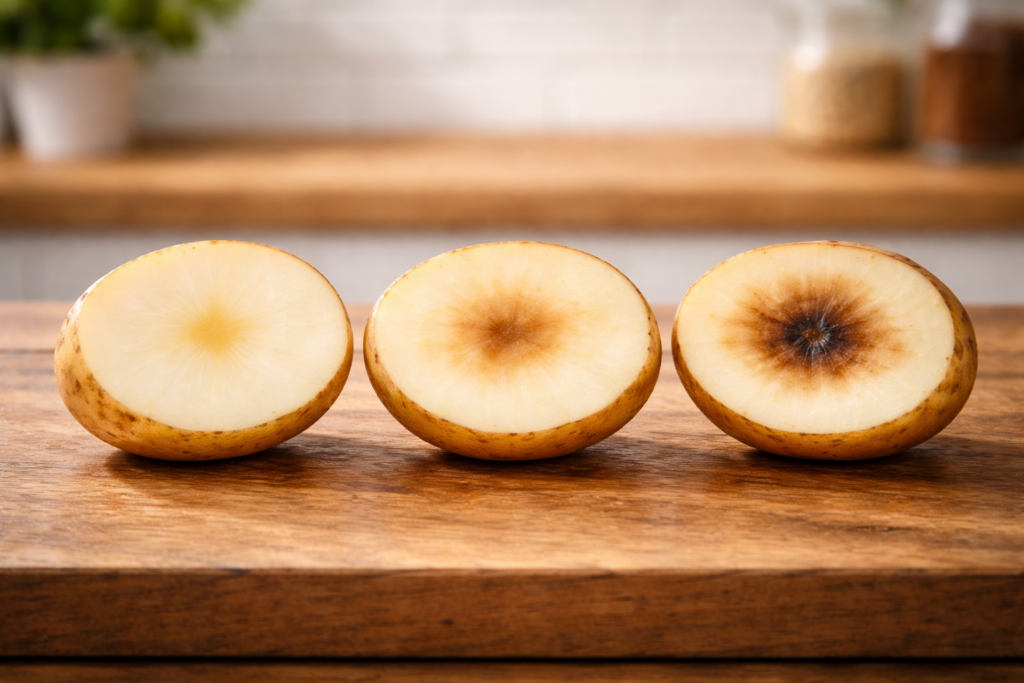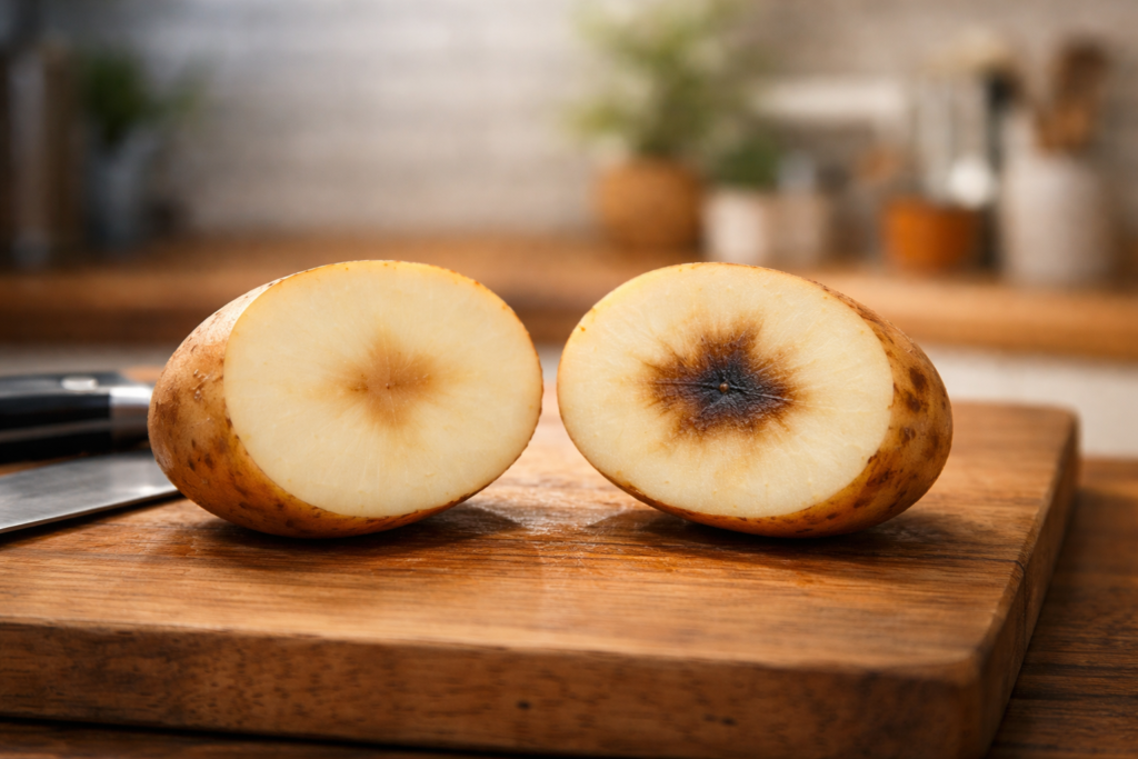 急激に成長したじゃがいもに起こりやすい現象で、内部に空洞や変色が見られます。