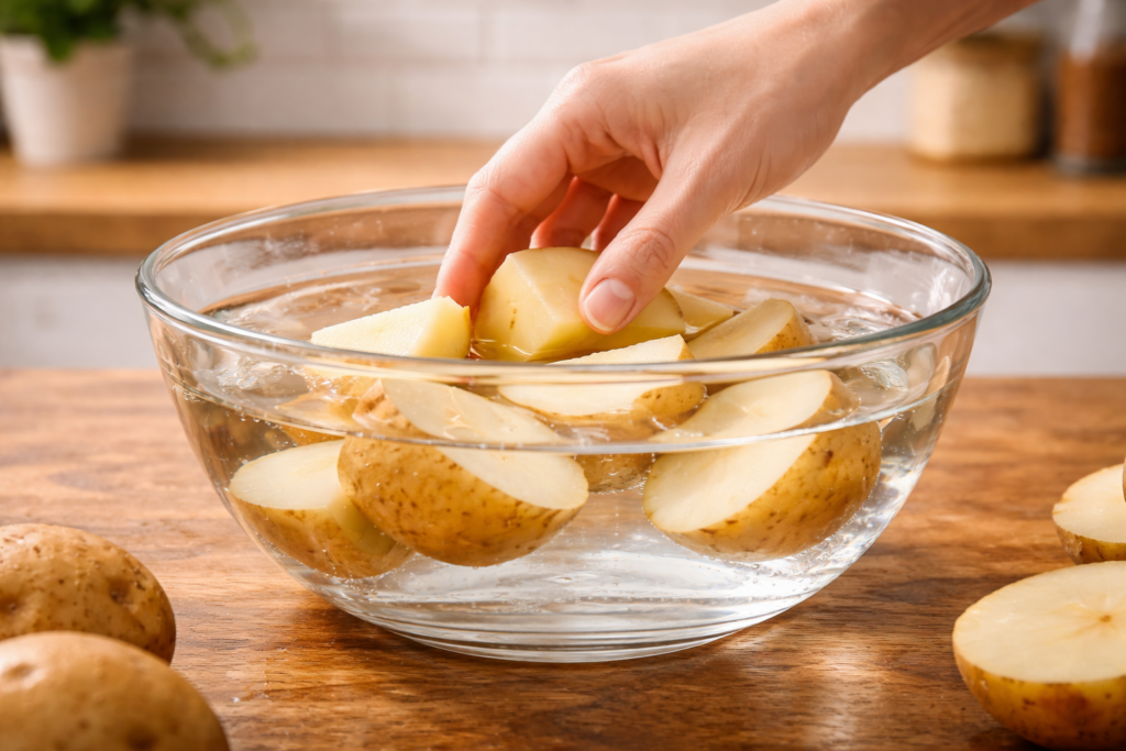ボウルにたっぷりの水を用意し、切ったじゃがいもをしっかり浸すようにしましょう。
