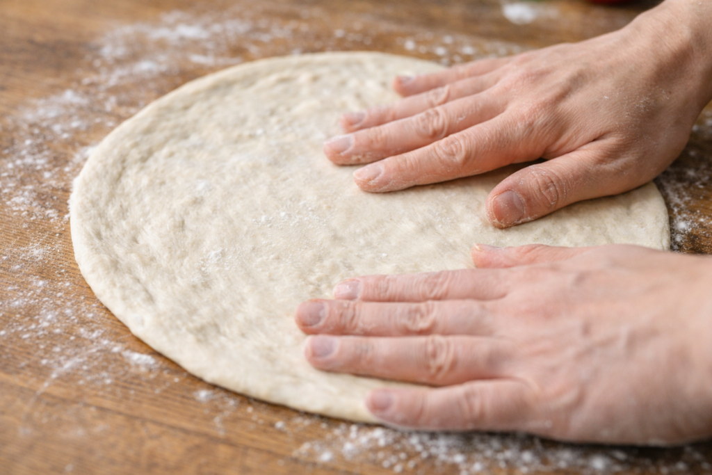クリスピー生地にするためには、ガスを適度に残しながら薄く均一に伸ばすことが重要です。