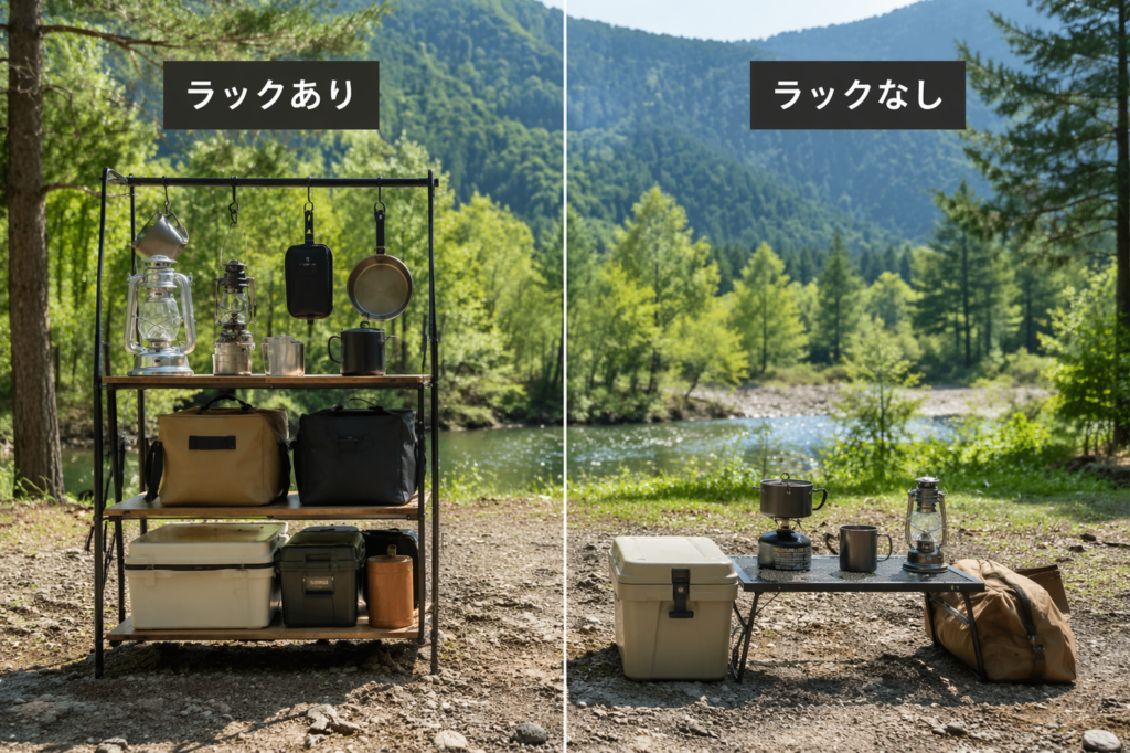 ラックは便利な反面、持ち運びや設営の手間が増えるため、シンプルなキャンプを好む人にとっては負担になりやすいです。