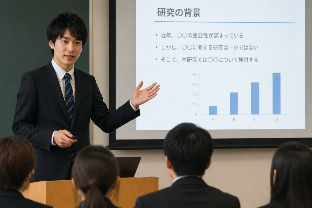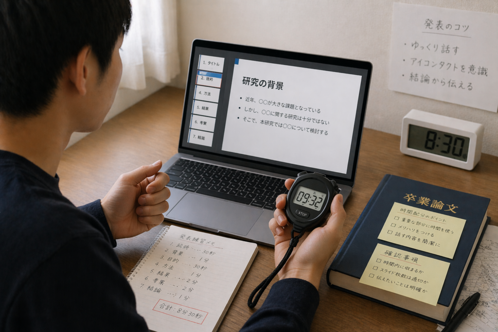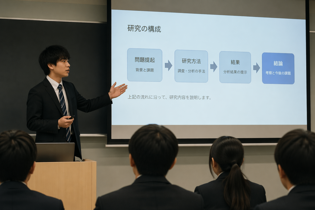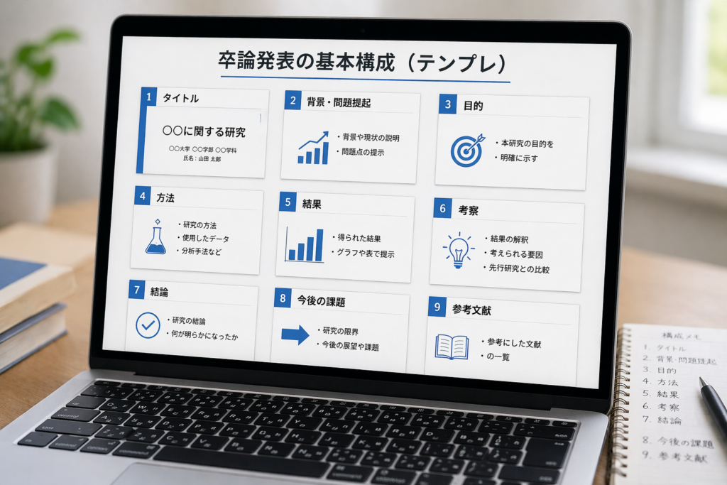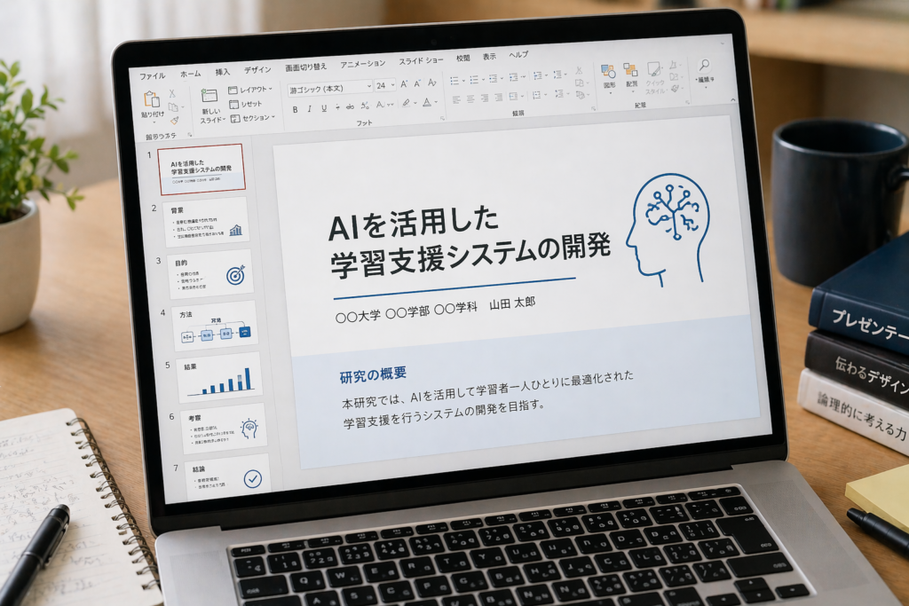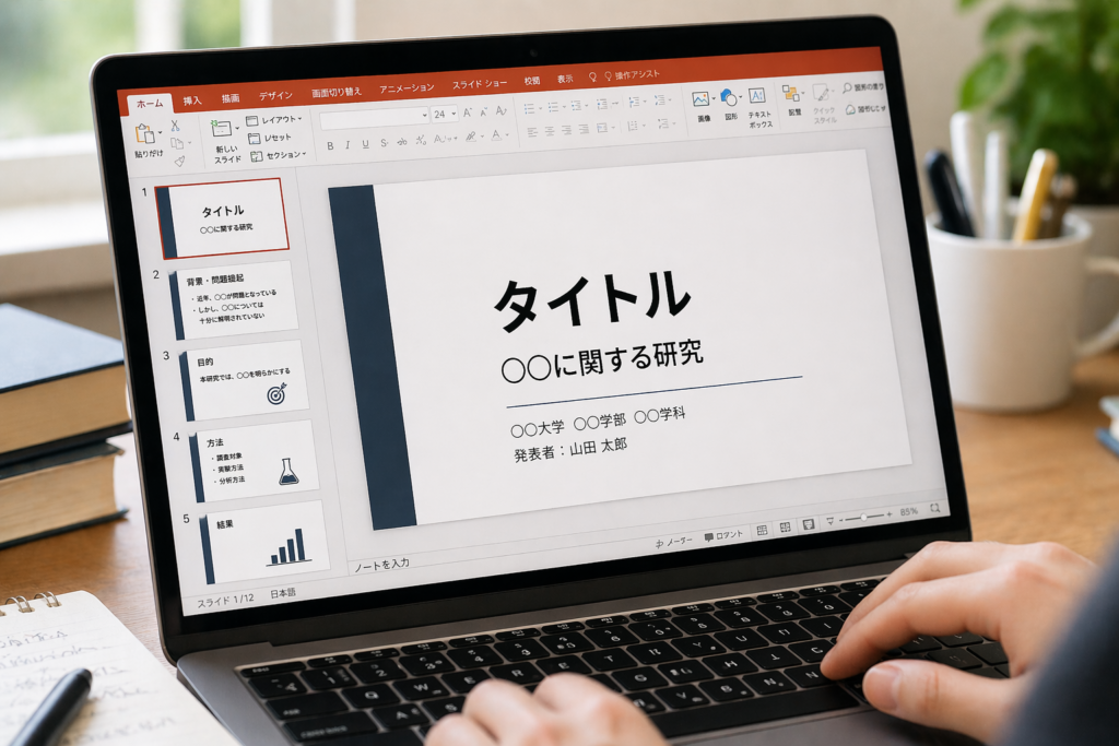 本記事では、卒論パワポの正しい構成から、スライドの作り方、枚数・時間配分、さらに発表のコツまでを網羅的に解説します。