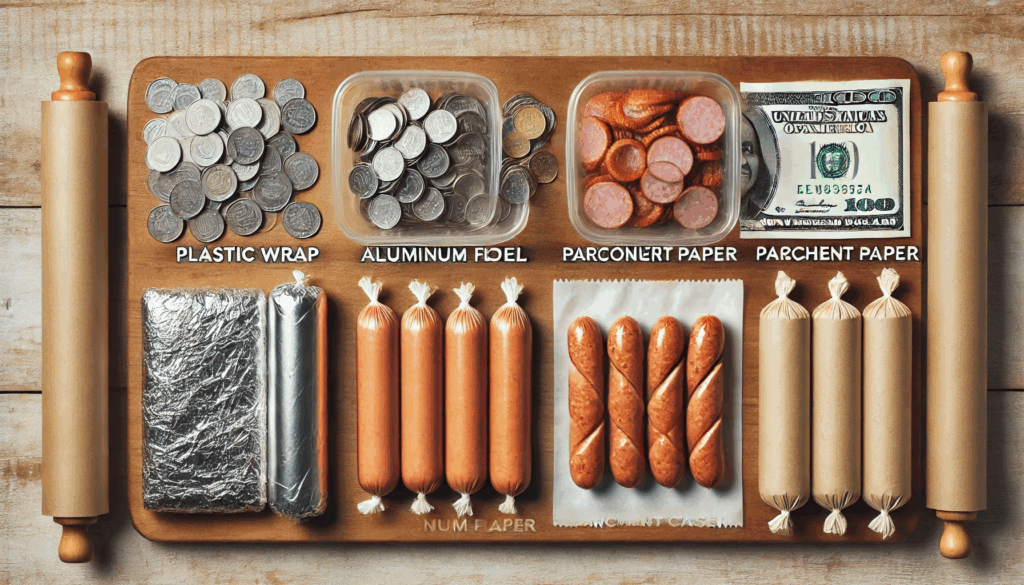 手作りソーセージでは、使う代用品によって食感や見た目、風味が大きく変わります。たとえばラップで包んだものはなめらかな表面になり、柔らかくしっとりした食感に仕上がります。一方、アルミホイルで包んで焼いた場合は、しっかりとした歯ごたえが出やすく、香ばしさも加わります。