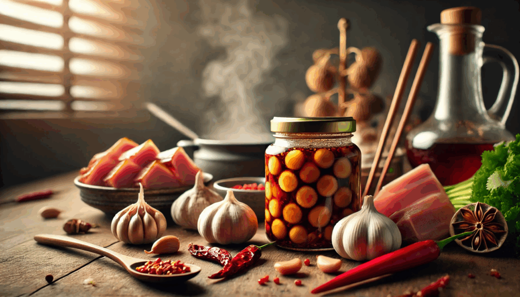 本格的なXO醤を家庭で作るには、いくつかの旨味食材がポイントになります。基本の材料としては、干し貝柱(5g)、干しエビ(10g)、にんにく(2片)、赤唐辛子(1本)、金華ハムやベーコン(30g程度)、そしてサラダ油(大さじ3〜4)を使います。また、オイスターソースや紹興酒、しょうゆを少量加えることで味に深みが出て、本場のXO醤に近づきます。
